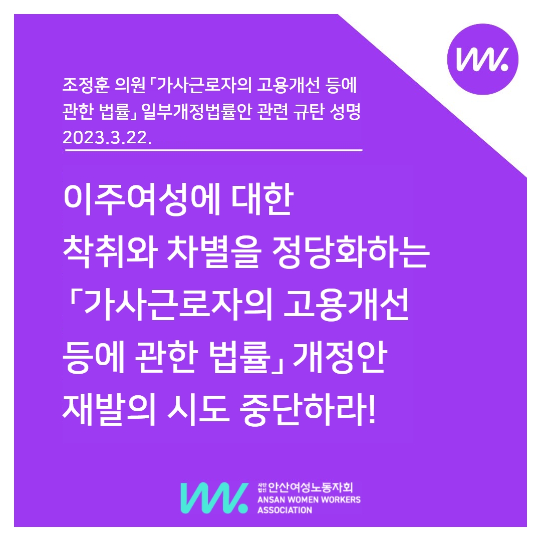 언론에 따르면 시대전환 조정훈 의원은 외국인 가사노동자에게 최저임금 적용을 배제하는 내용 등이 담긴 「가사근로자의 고용개선 등에 관한 법률」 일부개정법률안을 이르면 오늘(22일) 재발의하겠다고 밝혔다. 이 법안은 어제(3/21) 조정훈 의원이 대표 발의했으나 공동발의 의원 일부가 발의에 참여하지 않기로 하면서 하루만인 오늘 오전 철회됐다. 우리는 이주여성에 대한 착취와 차별을 정당화하는 해당 개정안에 단호히 반대하며, 재발의 시도를 중단할 것을 촉구한다.
