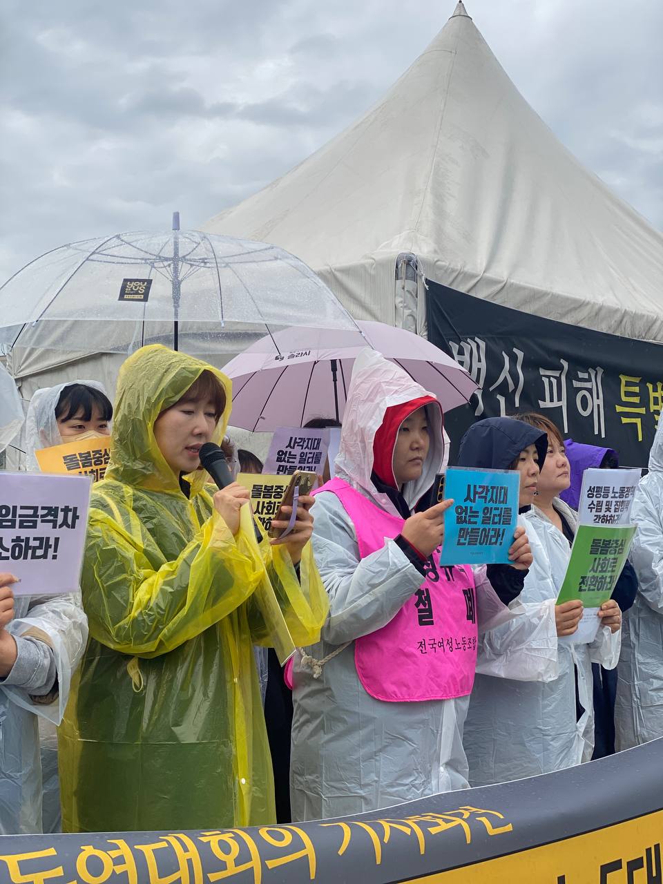 기자회견은 현장발언과 ‘여성노동자의 명을 받으라’ 퍼포먼스, 기자회견문 낭독 순으로 진행되었으며, ▶성별임금격차 해소, ▶안전하고 평등한 일터 조성, ▶사각지대 없는 일터 실현, ▶돌봄중심사회로 전환, ▶성평등 노동정책 수립 및 집행력 강화 등을 5대 여성정책요구로 제시하였습니다.