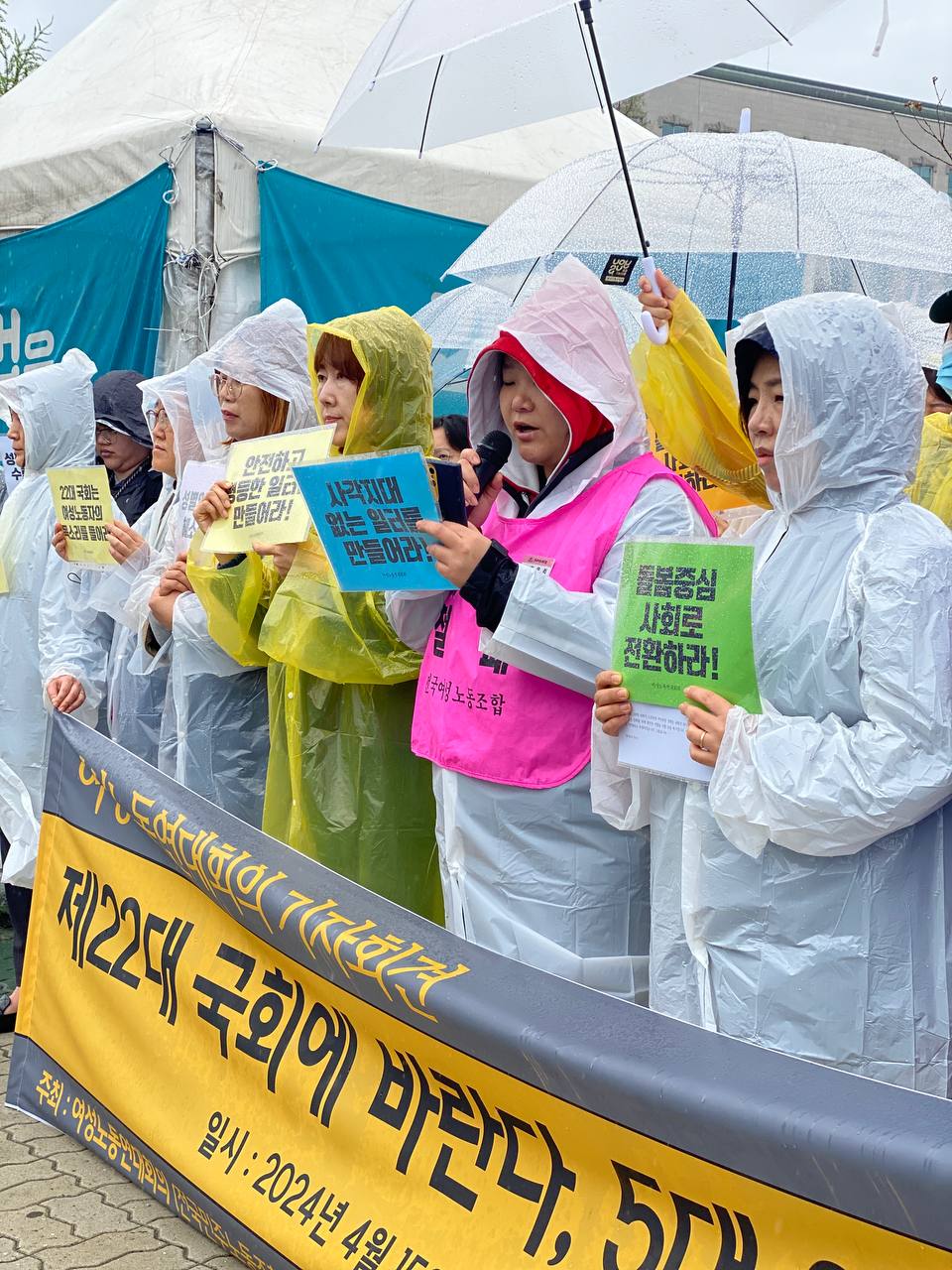 22대 국회는 여성노동자, 여성유권자의 목소리를 잊지 않아야 한다. 여성노동자는 안전하고 성평등한 일터를 원한다. 누구도 차별로 인해 생계를 위협받지 않고 안전한 일터를 만드는데 22대 국회가 적극적으로 나서기를 강력히 촉구한다.