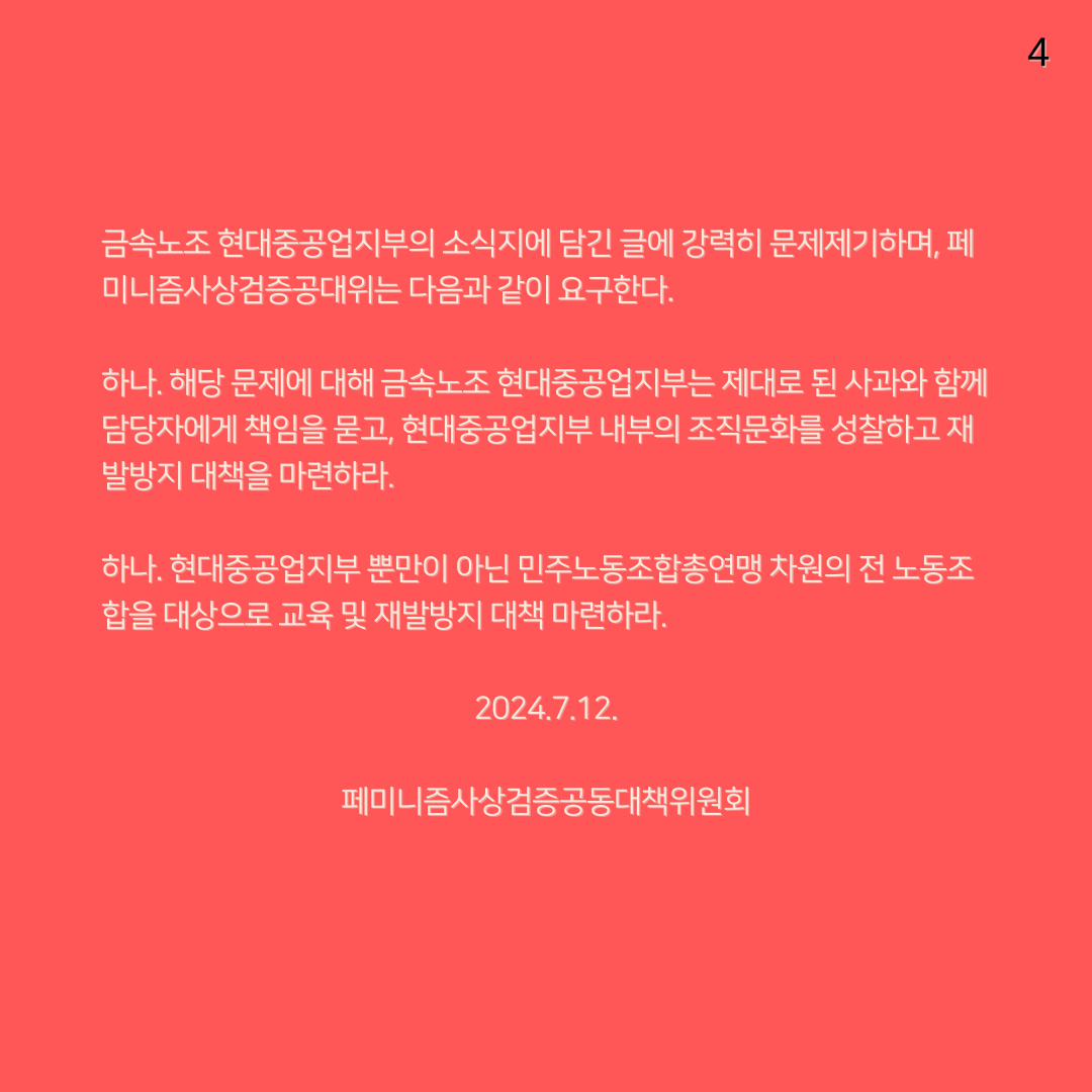 금속노조 현대중공업지부의 소식지에 담긴 글에 강력히 문제제기하며, 페미니즘사상검증공대위는 다음과 같이 요구한다.