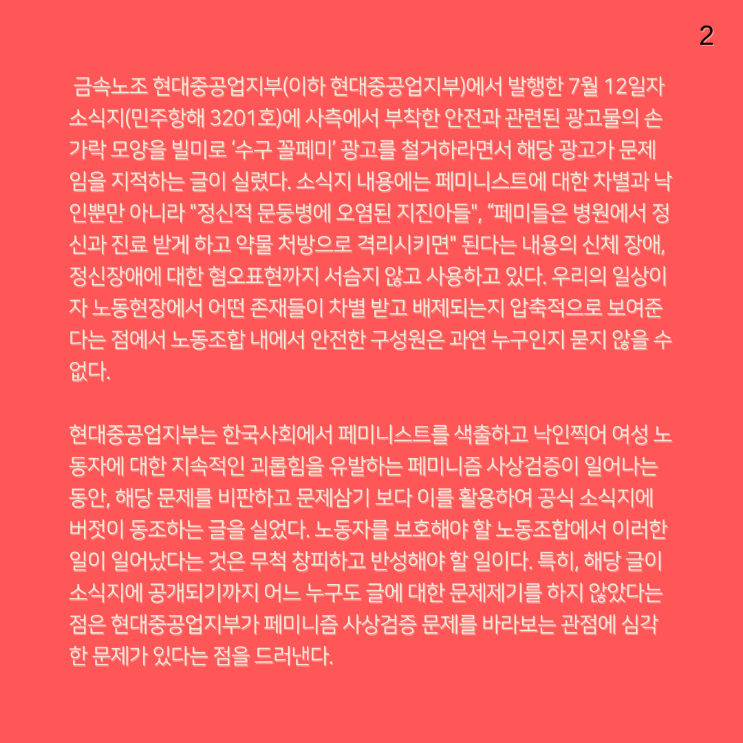 - 금속노조 현대중공업지부 소식지 내 "페미니즘 사상검증"을 비판하며