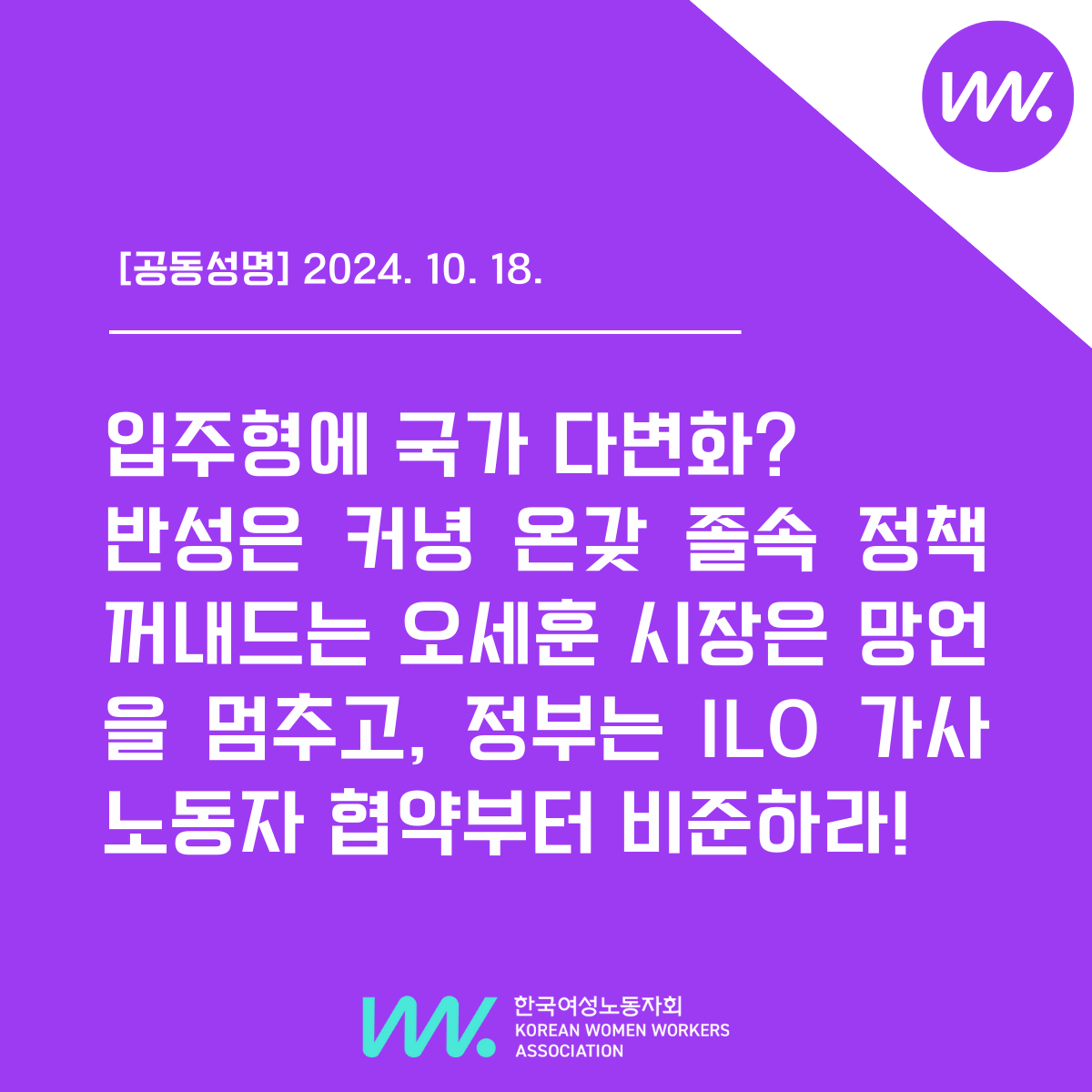 [공동성명]"입주형에 국가 다변화? 반성은커녕 온갖 졸속 정책 꺼내드는오세훈시장은 망언을 멈추고, 정부는 ILO 가사노동자협약부터 비준하라!"