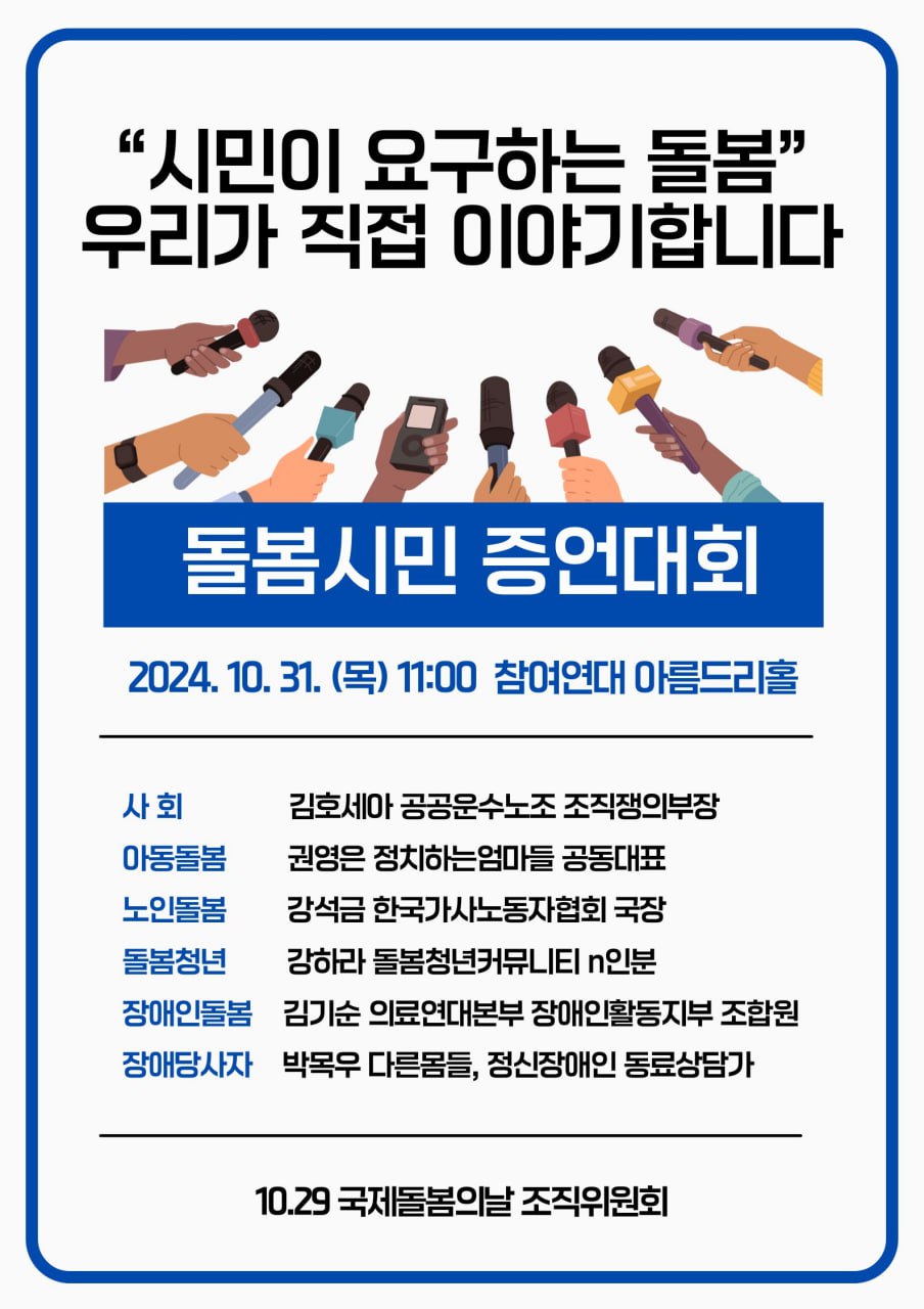 아동돌봄, 노인돌봄, 돌봄청년, 장애인돌봄, 장애당사자 등 여러 시민분들이 들려주실 돌봄에 대한 다양한 경험과 바램을 통해 우리 사회 돌봄이 나아가야 할 길을 함께 고민해볼 수 있는 금번 증언대회에 많은 관심 부탁드립니다.