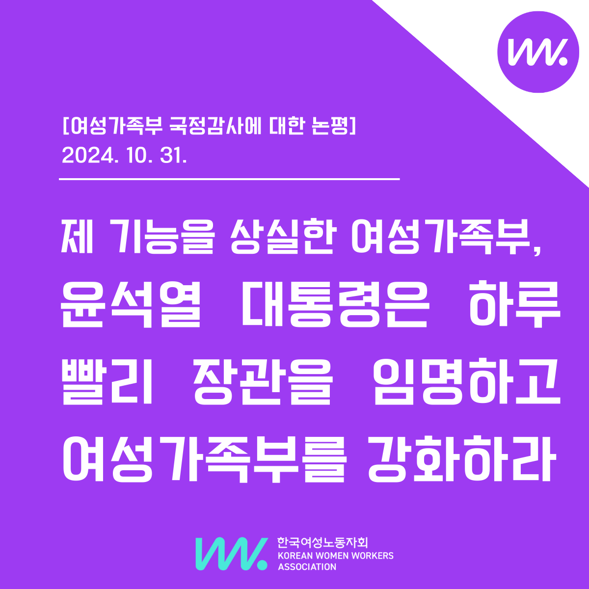 대선 시기부터 ‘구조적 성차별은 없다’며 여성가족부 폐지, 성폭력처벌법에 무고 조항 신설 등의 공약을 내세워온 윤석열 정부는 반여성·반인권적 정책 기조 아래 9개월에 가까운 기간 동안 여가부 장관을 공석으로 두면서 여성인권과 청소년, 가족 등의 문제들을 제대로 해결하지 못하고 있다. 윤석열 정부는 그 동안 수많은 여성시민들의 힘으로 진전시켜 온 성평등 제도와 정책 그리고 국가 성평등 정책 총괄 부처인 여성가족부를 무력화하고 더 나아가 사회 전반의 성평등 의식을 퇴행시키고 있다. 더 이상은 안 된다. 윤석열 대통령은 어제 진행된 여가부 국정감사의 결과를 뼈아프게 받아들이고, 하루 빨리 여성가족부 장관을 임명하여 국가 성평등 정책 총괄 부처로서의 역할을 제대로 수행할 수 있도록 해야 하며, 여가부의 인력과 예산, 권한을 확대하고 강화해야 한다. 더불어 윤석열 정부는 현재의 반여성·반인권적 정책 기조를 전면 전환해야 한다.