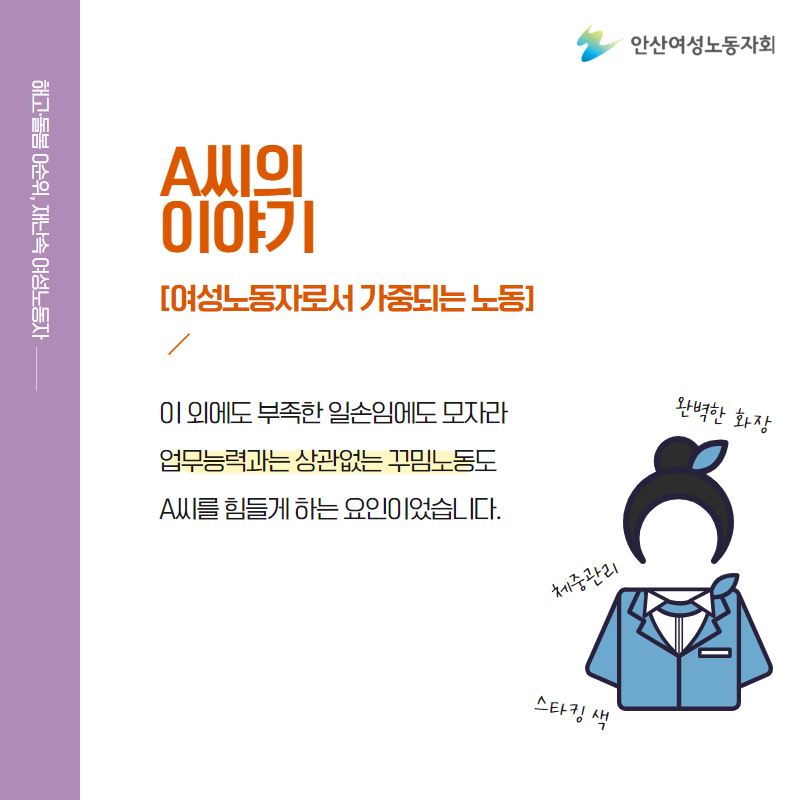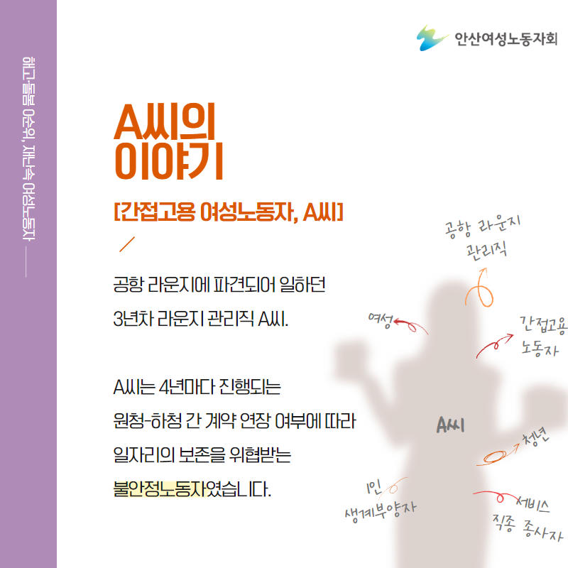 A씨는 공항라운지에 파견되어 원청-하청간 계약 연장 여부에 따라 일자리의 보존을 위협받는 불안정노동자다. 원청 승인 없이는 인사, 채용 등이 이루어지지 않아 적은 인원이 근무하고 있다. 그러다보니 자신이 맡은 업무 외의 것도 하기 일쑤. 더불어 업무능력과는 상관없는 꾸밈노동까지 요구 받았다.