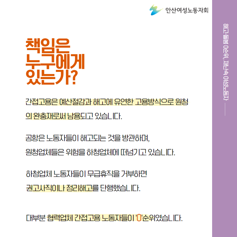 코로나19 감염병 사태로 공항이 타격을 겪자, A씨는 무급휴가를 10일이나 사용해야했다. 하지만 업무량이 너무 많아 그 와중에도 출근을 해야만 하는 상황. 이를 견디던 A씨에게 원청은 문자로 해고 통보를 했다. 공항은 이러한 상황을 방관했고, 원청은 하청업체 노동자들이 무급휴직을 거부하면 권고사직이나 정리해고를 단행했다. 간접고용 노동자들은 예산절감을 손쉽게 할 수 있는, 해고 '0순위'였던 것이다.