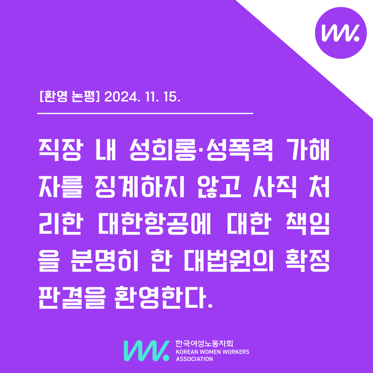 [환영 논평] 직장 내 성희롱·성폭력 가해자를 징계하지 않고 사직 처리한 대한항공에 대한 책임을 분명히 한 대법원의 확정 판결을 환영한다.