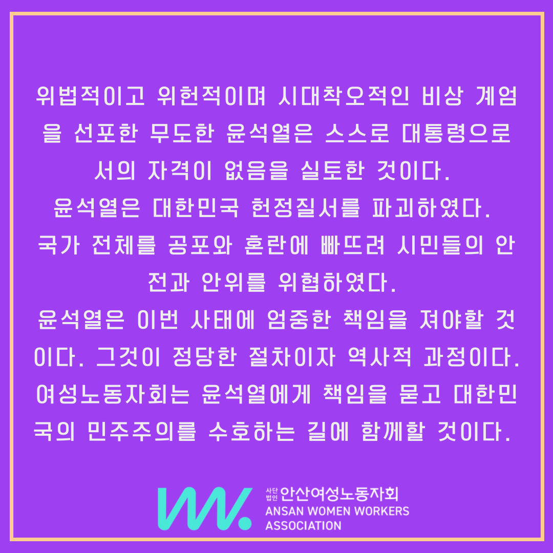 위법적이고 위헌적이며 시대착오적인 비상 계엄을 선포한 무도한 윤석열은 스스로 대통령으로서의 자격이 없음을 실토한 것이다. 윤석열은 대한민국 헌정질서를 파괴하였다. 국가 전체를 공포와 혼란에 빠뜨려 시민들의 안전과 안위를 위협하였다. 윤석열은 이번 사태에 엄중한 책임을 져야할 것이다. 그것이 정당한 절차이자 역사적 과정이다. 여성노동자회는 윤석열에게 책임을 묻고 대한민국의 민주주의를 수호하는 길에 함께할 것이다.