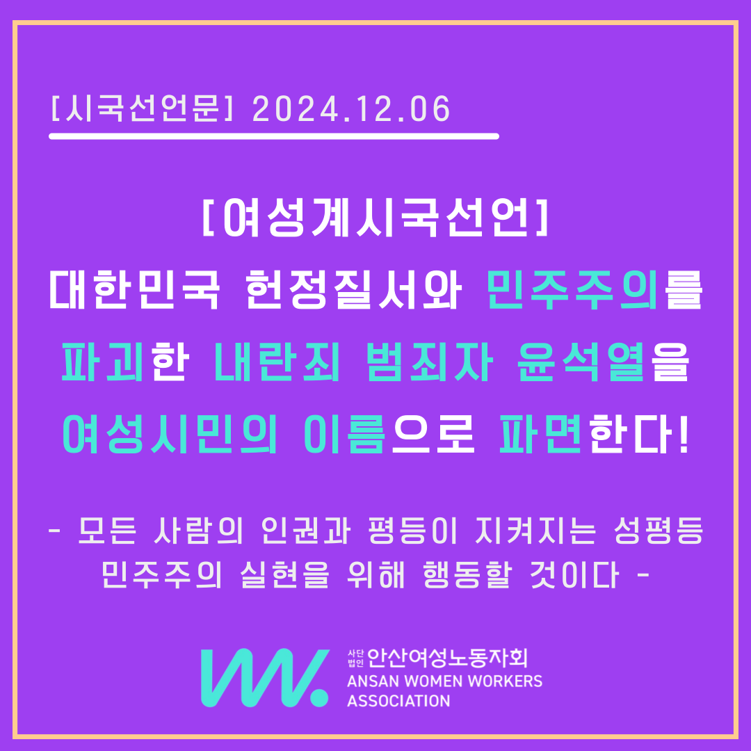 [여성계 시국선언문] 대한민국 헌정질서와 민주주의를 파괴한 내란죄 범죄자 윤석열을여성시민의 이름으로 파면한다