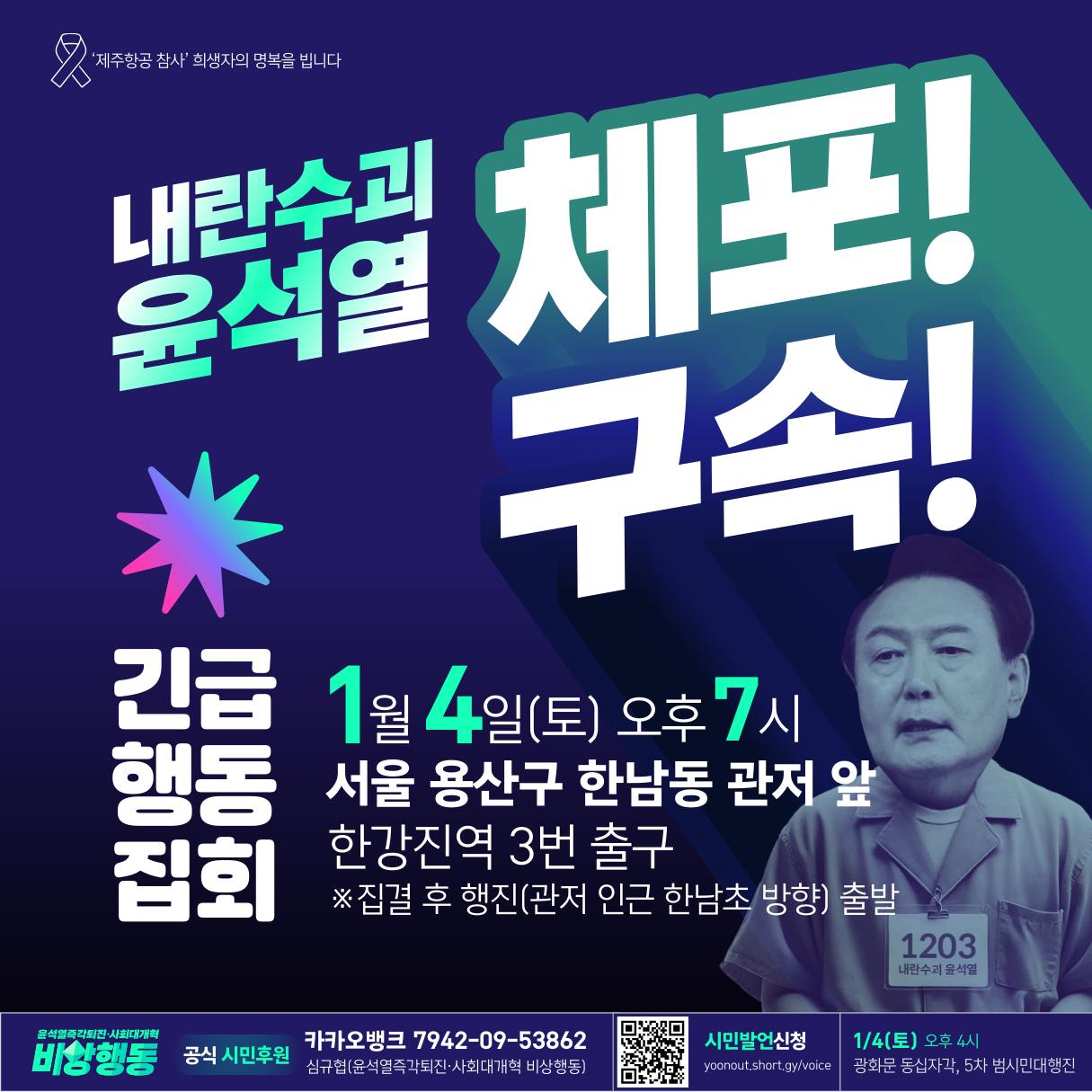 ✨1월 4일(토) 저녁 7시 긴급행동 집회 한강진역 3번 출구 / 집결 후 행진(관저 인근 한남초 방향) 출발