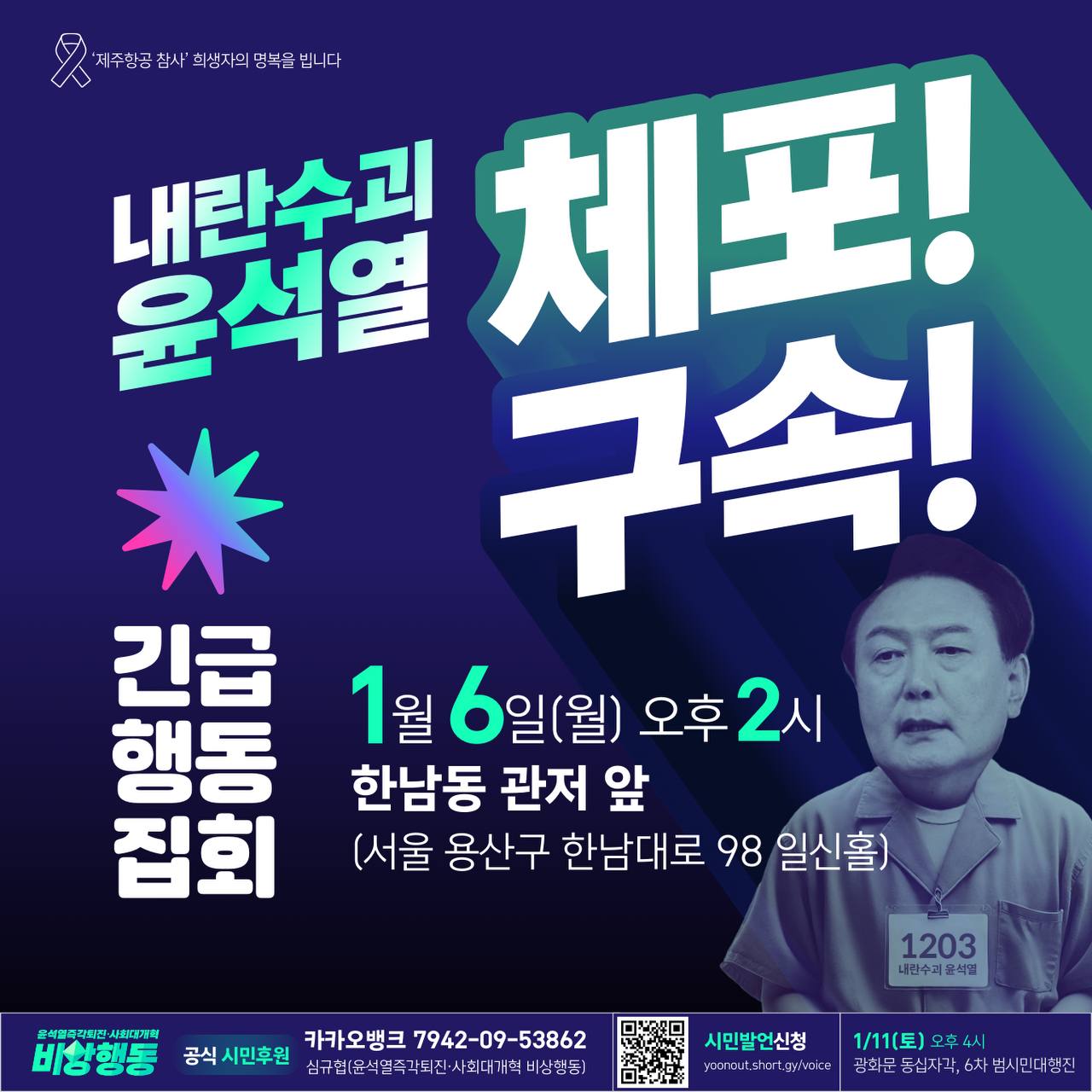 📌 일시, 장소 : 2025년 1월 6일(월) 오후2시, 한남동 관저 앞(서울 용산구 한강대로 98 일신홀 앞)