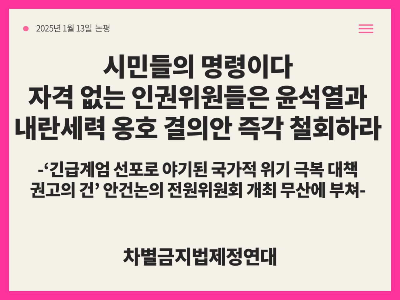 지난 1월 10일 국가인권위원회의 윤석열과 윤석열 비호세력 옹호를 위한 ‘긴급계엄 선포로 야기된 국가적 위기 극복 대책 권고의 건’의 내용이 전해지고 시민사회, 전현직 국가인권위원회 구성원, 그리고 이를 용납할 수 없는 시민들의 거센 항의와 규탄성명, 직접행동이 쏟아졌다. 김용원, 한석훈, 이한별, 김종민(원명스님), 강정혜 위원과 안창호 위원장에게 경고한다. 국가인권위원회가 채택해서는 안될 이 권고안을 다시 상정할 생각을 집어치워라. 오늘 당신들의 만행을 막아낸 우리는 해당 안건이 철회될 때까지 인권위의 후퇴, 내란옹호세력 비호를 막아내는 투쟁을 멈추지 않을 것이다.