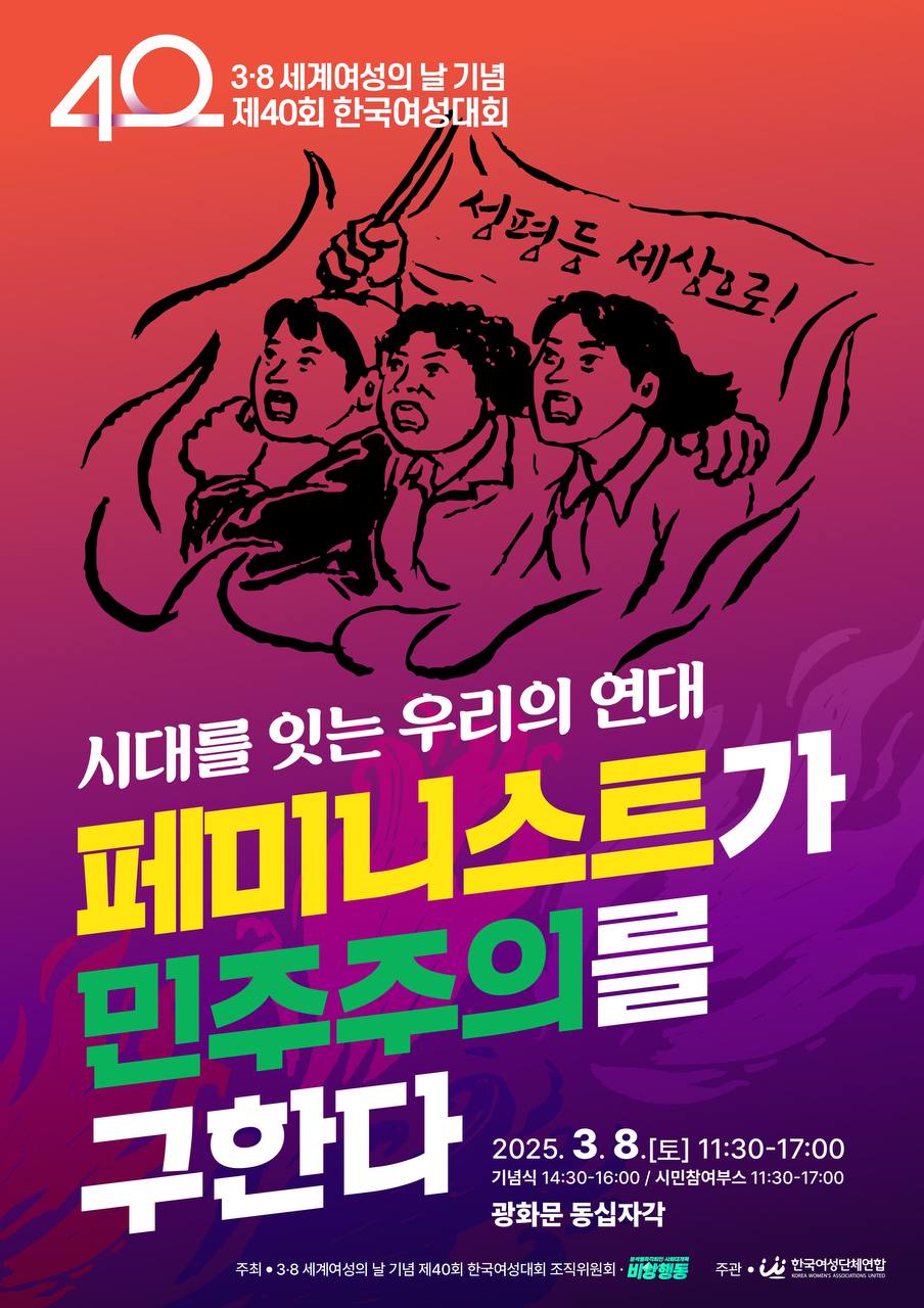 제40회 한국여성대회가 3월 8일(토), 윤석열 퇴진과 사회대개혁을 위해 목소리를 모아온 광화문 동십자각에서 개최됩니다. 시대적 혐오와 차별, 폭력에 맞서 민주주의 실현을 위해 늘 최전선에서 싸워온 페미니스트들의 힘과 연대를 함께 보여줍시다! 우리의 목소리를 광장에서 함께 외칩시다!