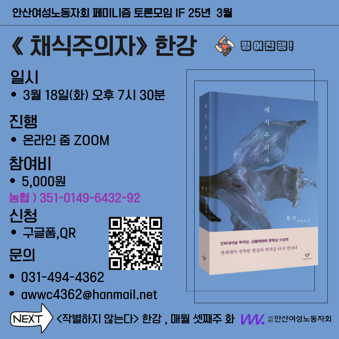 몸에 대한 통제, 억압, 비건, 인간과동물 그리고 자연, 폭력, 가부장제 등에 대해서 자유롭게 이야기 하면서 소설에 대한 이야기를 나눠요!