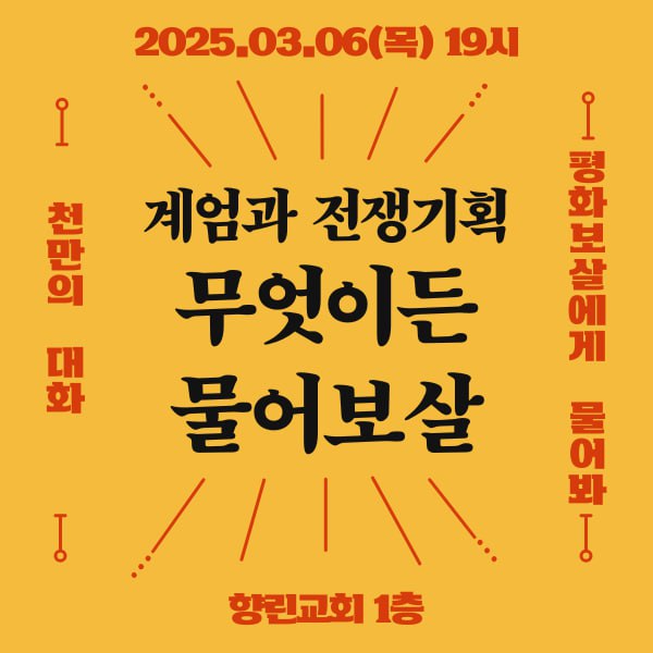 - 일시 및 장소 : 2025년 3월 6일(목) 오후 7시, 향린교회 1층 (종로구 경희궁2길 11)