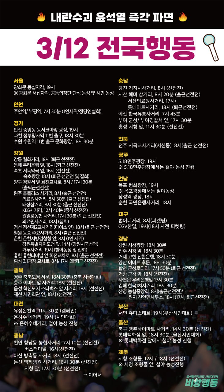 🔥2025년 3월 12일 서울 광화문 동십자각, 19시 ※ 광화문 서십자각, 공동의장단 단식 농성 및 시민 농성