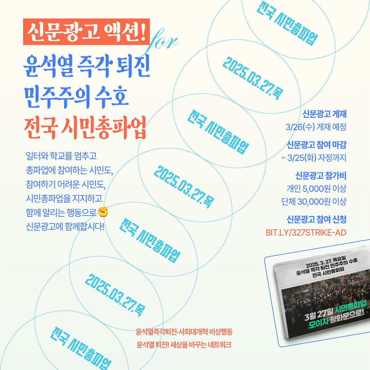 [신문광고] 3.27 ‘윤석열 즉각 퇴진 민주주의 수호 전국 시민총파업’을 알리는 신문광고에 함께 합시다!