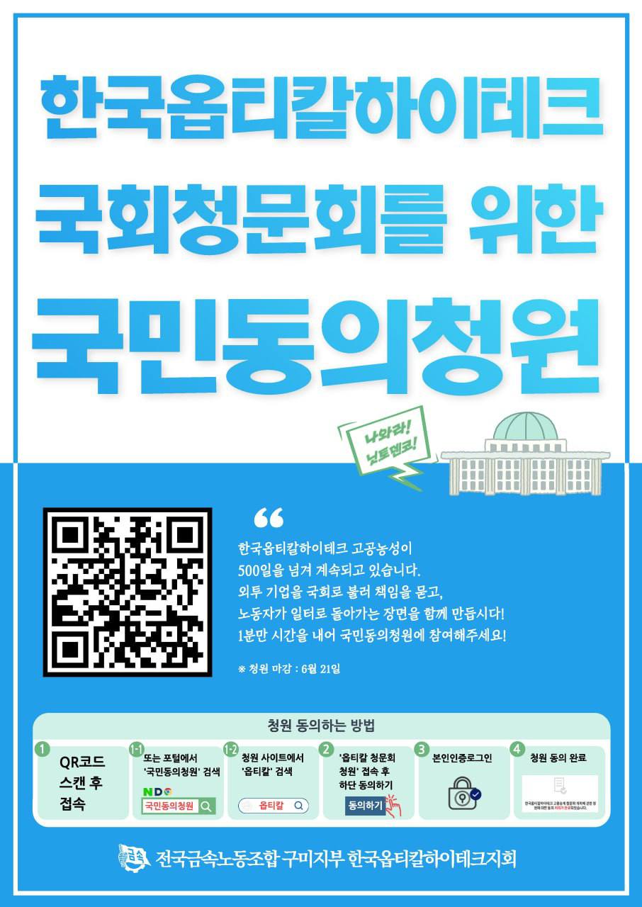 단 한 번도 면담에 응하지 않은 외투 기업, 국회로 불러야 합니다. 국회 청문회를 통해 고용승계에 대한 책임을 묻고, 옵티칼 노동자는 일터로 돌아가는 장면을 함께 만듭시다.