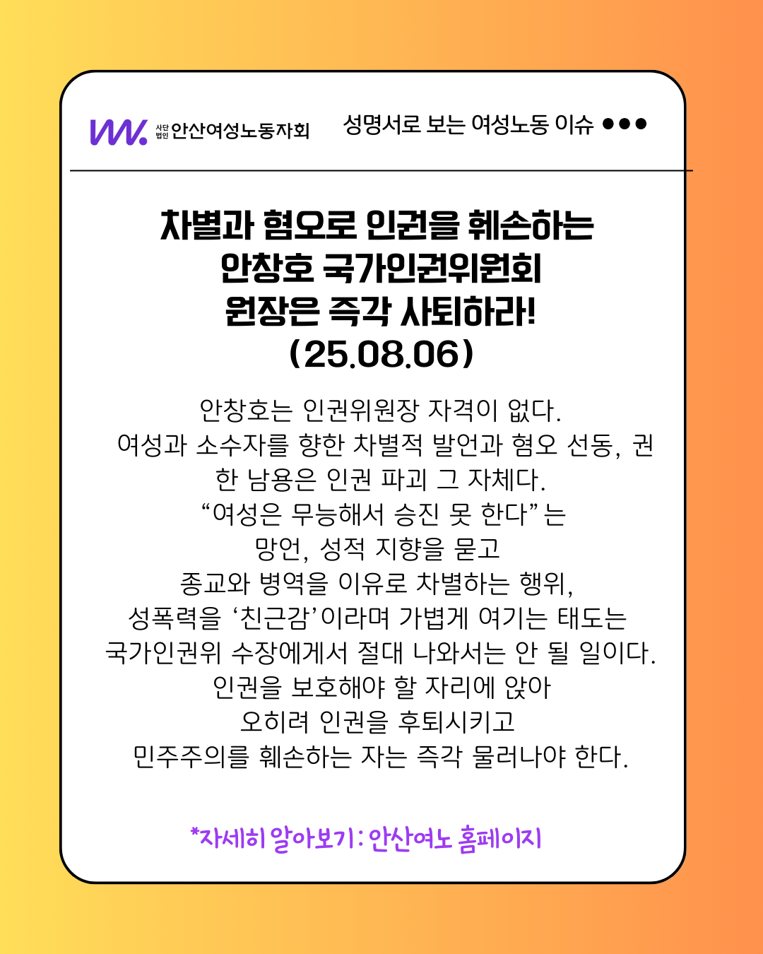 - 인권을 후퇴시키는 국가인권위원회 위원장 안창호 즉각 사퇴 촉구