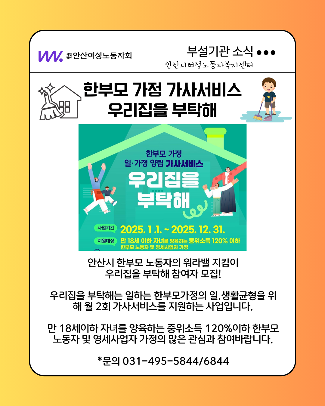 일하는 한부모 노동자의 워라밸 지킴이, 월 2회 가사서비스 지원 사업.