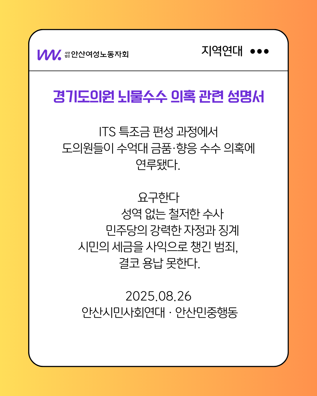 ITS 특조금 편성 과정에서 도의원들의 수억대 금품·향응 수수 의혹 규탄.