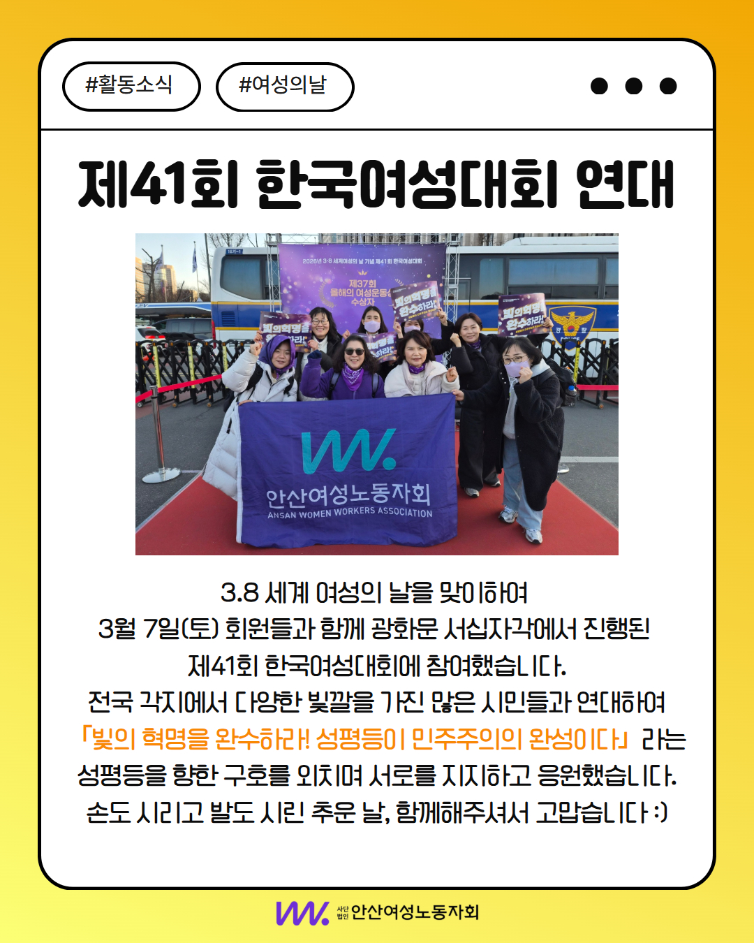 안산여성노동자회는 제 41회 한국여성대회에 참여하여 성평등을 향한 구호를 힘차게 외쳤습니다.